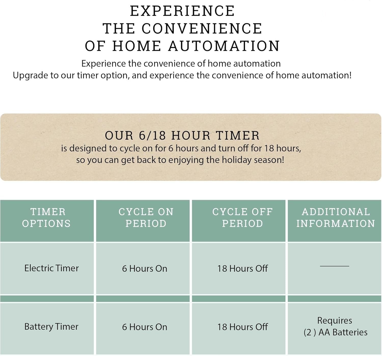 CONVENIENT TIMER: Upgrade to our battery or electric timer options, and experience the convenience of home automation with 6hrs on / 18 hrs off.