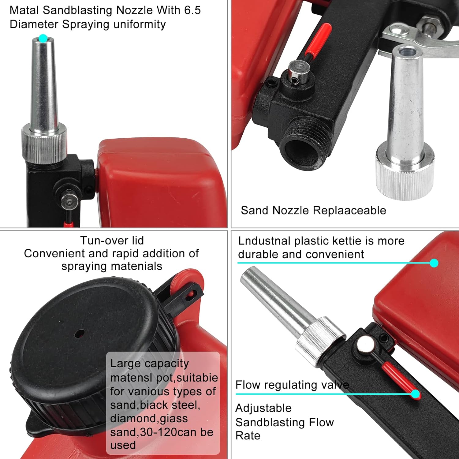 Enhanced Design: anti-slip handle, comfortable grip, aluminum alloy trigger, high-hardness steel valve core, easy to operate.Suitable for all kinds of sand: glass beads, river sand, emery, quartz sand and other sands.