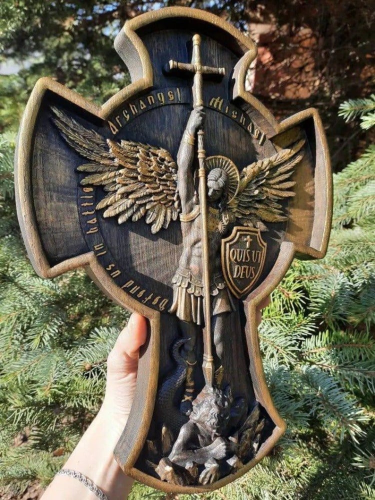 - he perfect and lovely carving of the Archangel Michael. The bracket makes it very suitable for any room in the house. The details are great. There is a pawl on the back of the icon, which can be hung on the wall or placed on a solid surface.