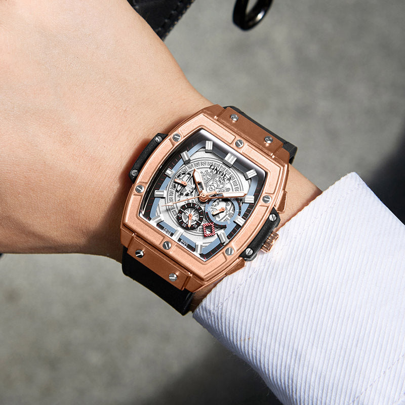 Our first chronograph watch features our signature design, a high-precision Japanese Quartz movement, and a meticulously engineered premium stainless steel case plated in rose gold. This daring wristwatch will get noticed for its bold look, its intricately stitched genuine leather strap, and its substantial full steel casing with gunmetal accents. The superior construction and elegant design elevate this timepiece to another level. It features an easy-to-read dial with chronograph movement, 24-hour sub-dial & date function. Built for those with a penchant for details and exactitude.
