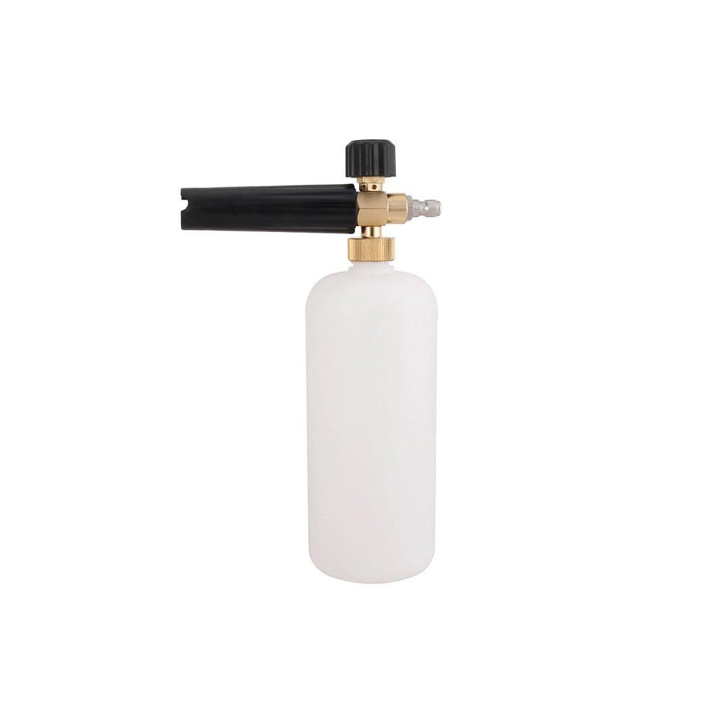 First, you can fill some soap in the bottle with hot water to get thick lather; Second, use 1/4" quick connect connector to connect pressure washer gun or wand; Finally, adjust the button on the top to the desired foam level, then thick foam is spread. The button adjusts the amount of foam dispensing, and the nozzle adjusts the sprinkled pattern.