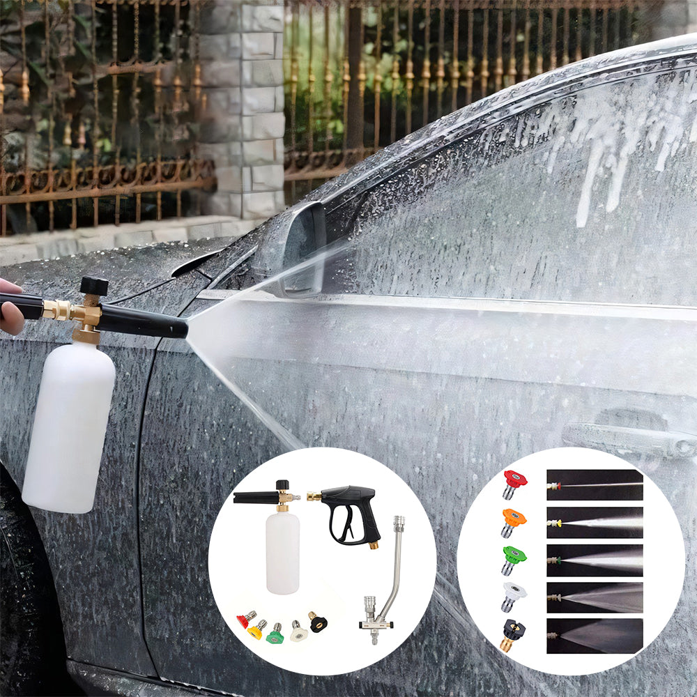 Transform your cleaning routine with our innovative dual-plug foam blaster accessory, designed to connect a pressure washer nozzle and snow foam cannon simultaneously.