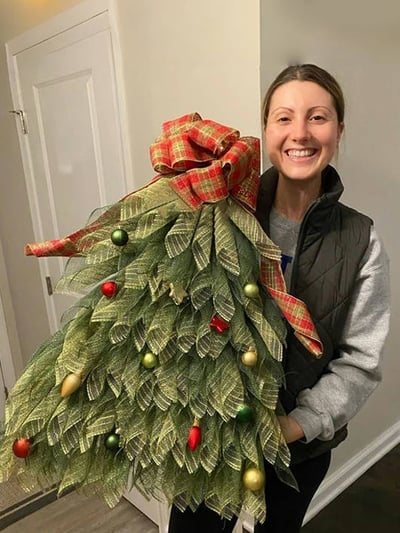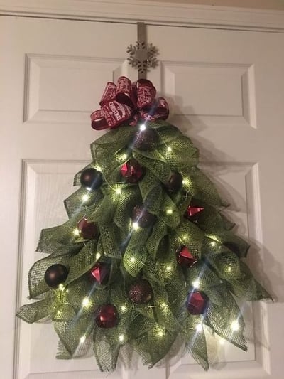 🎄The Christmas tree body is made of green polyester burlap netting. The bow topper is red, and green polyester burlap netting. (Red, Green, Gold)Berry accents and a cute bow with the Christmas tree decoration complete the look.