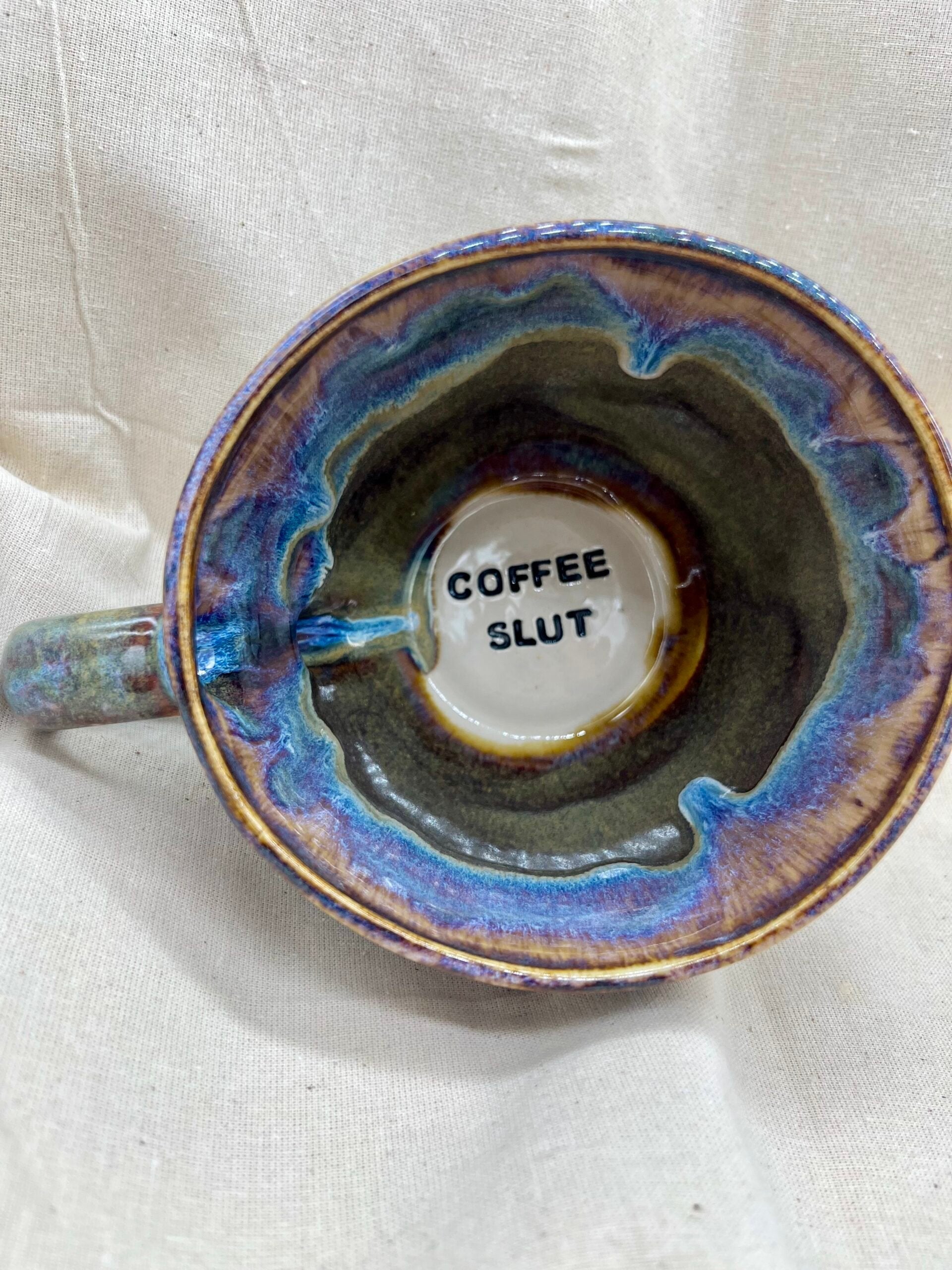 Handmade and hand glazed stoneware jumbo mug finished in the very popular lightning glaze which is a mix of brown and blue glazes and the text